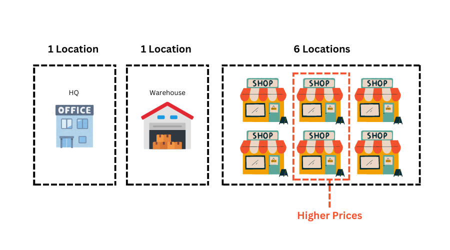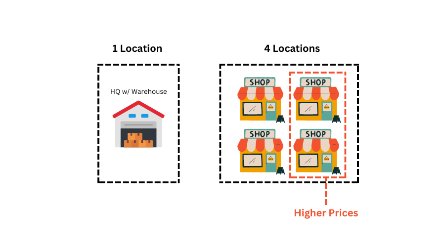 ABC now moved two of their shop locations to a more prime location, thus paying much higher rent. As such, they decided to increase the retail pricing for these two stores, while keeping the it same for the other two.